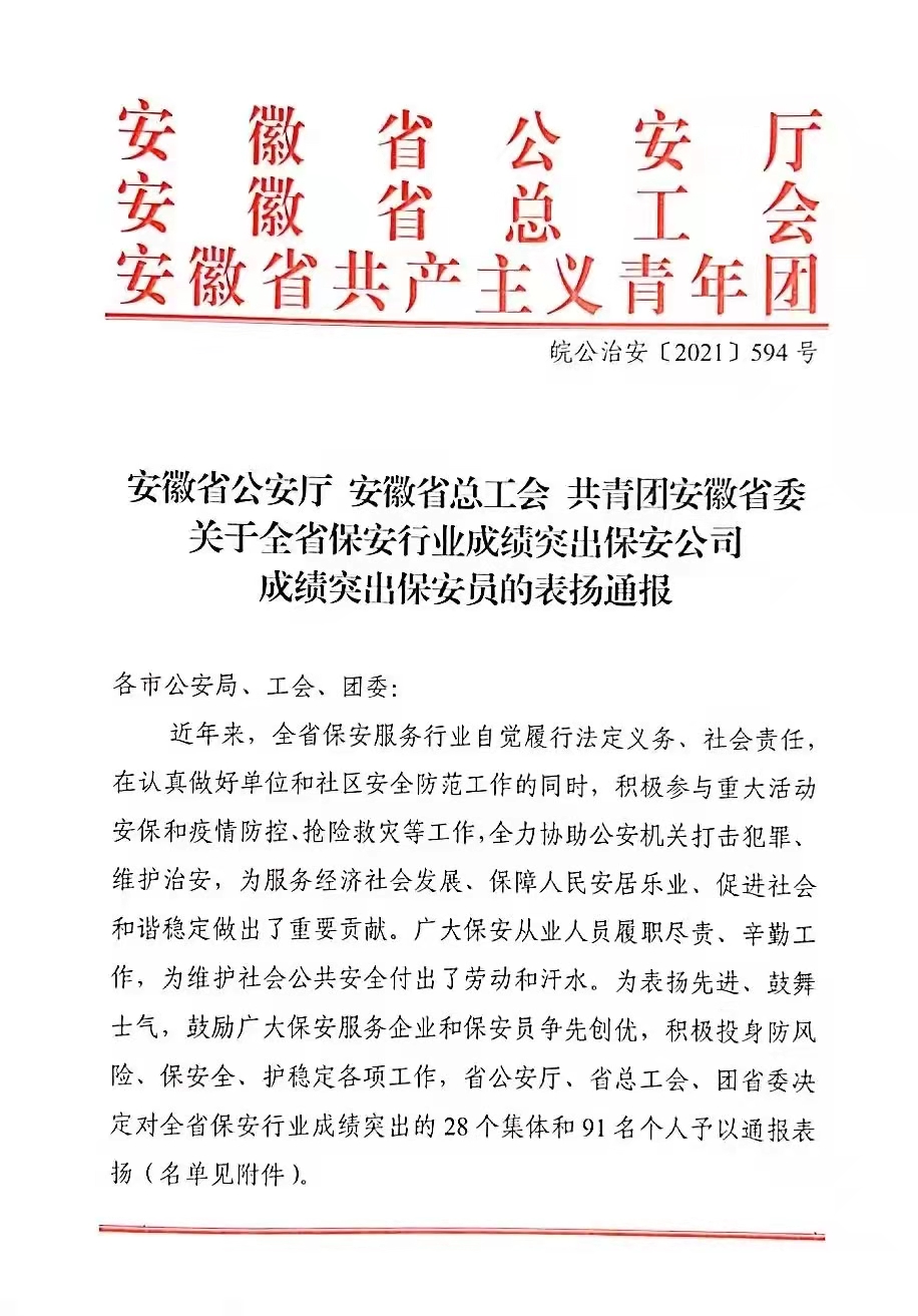 在第五届全国及全省先进保安服务公司和优秀保安员评选活动中,陈靖同志获评全国优秀保安员、公司获评全省先进保安服务公司、张万成获评全省优秀保安员。